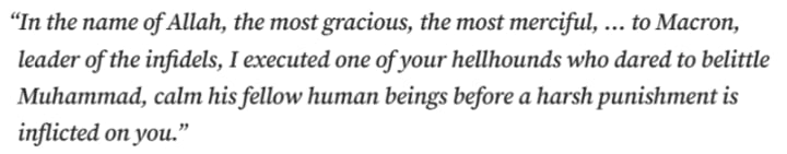 Minutes after the beheading, Anzorov took to Twitter to post a graphic image of Samuel's severed head accompanied by the caption: