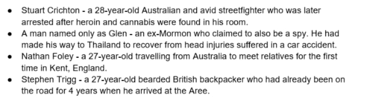On 9th August 2000, Kirsty settled into her ground-floor room at the Aree. At least eight other people were staying in the guesthouse that night, including the 33 year old owner, a British expat named Andrew Gill.