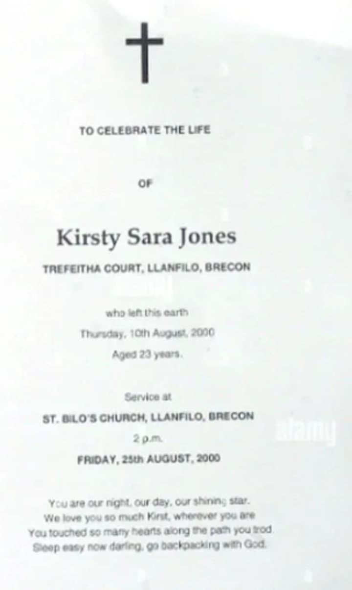 Kirsty’s body was flown home to Brecon, and her funeral was held on 25th August 2000.