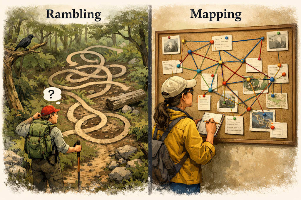 Listing assumes that ideas exist as independent units that can be organized without altering their meaning. Mapping assumes that ideas derive meaning from their connections to one another. A map is not read in a single direction. It is explored. The significance of any one point depends on how it relates to others. When a relational thinker explains something, they are often tracing those relationships in real time, showing how one concept leads to another, how causes cascade, and how patterns repeat at different scales. To someone expecting a list, this movement can sound unfocused. In reality, it is highly structured, just not sequential.