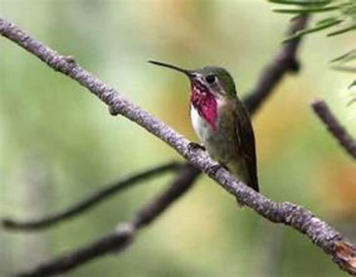 Calliope hummingbirds are the smallest birds in the US and Canada. Their species are found across western North America, from southern British Columbia and Alberta down to California, Colorado, and northern Mexico. The birds inhabit montane forests, regenerated woodlands, and mountain meadows. Calliope hummingbirds winter in the thorn forests and brushy pine-oak woodlands of southwestern Mexico. When it comes to mating during courtship, male birds perform U-shaped dives and shuttle displays while flaring their magenta-striped gorgets and making buzzing sounds with their wings and tail.
