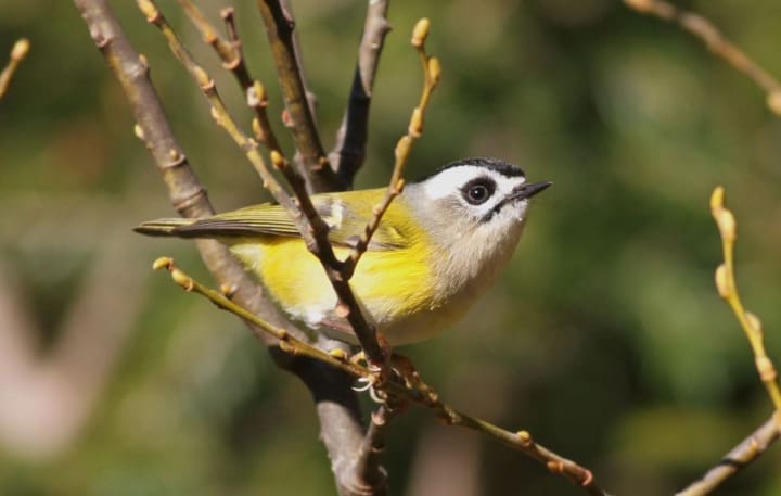 Golden-crowned kinglets inhabit the coniferous and mixed forests across North and Central America. They have fine bills, pale underparts, and striking crown stripes with yellow bordered by black and topped with an orange blaze in males. These birds are agile and energetic, flitting through dense coniferous branches, hovering, and gathering insects from needles and bark. In winter, they inhabit a wide array of coniferous and mixed woodlands, including urban parks and riparian thickets.