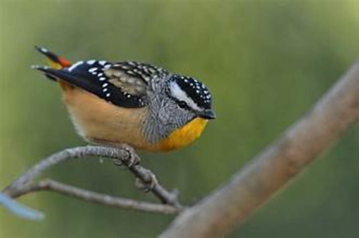 Spotted pardalotes inhabit the forests and woodlands of eastern and southern Australia. They are among the smallest and most visually striking birds in Australia. These birds forage high in the canopy for scale insects and lerps and are agile and deliberate in their movements. They play an important role in controlling the insect population in eucalyptus forests. Spotted pardalotes nest in burrows dug into earth banks or crevices, often in surprising places such as roadside cuttings or garden beds.