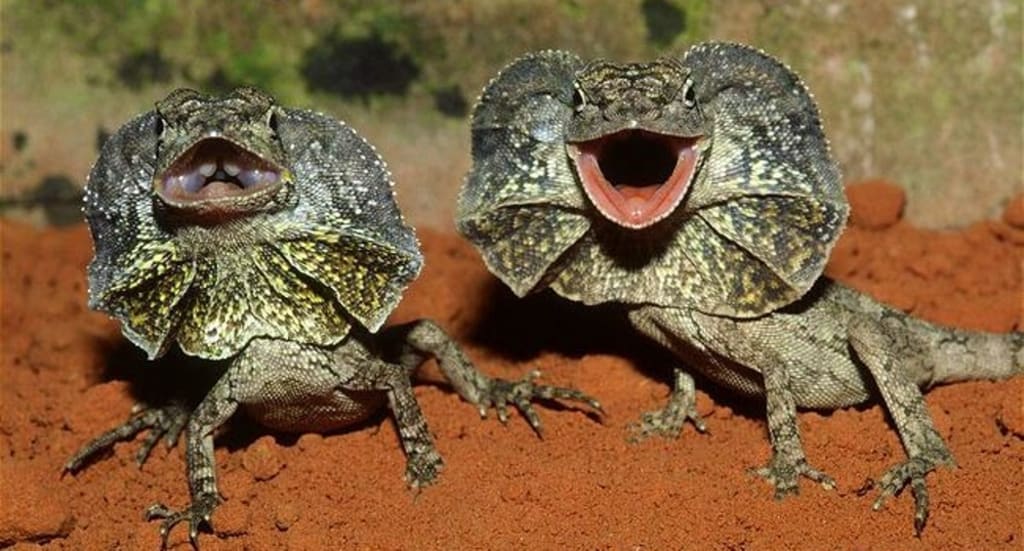 Native to northern Australia and New Guinea, frilled lizards were named for the large, frill-like flaps of skin around their necks. (pictured above) They raise the frill when they are threatened or intimidated. These lizards can run on their hind legs in short bursts. Frilled lizards primarily eat insects and small vertebrates.