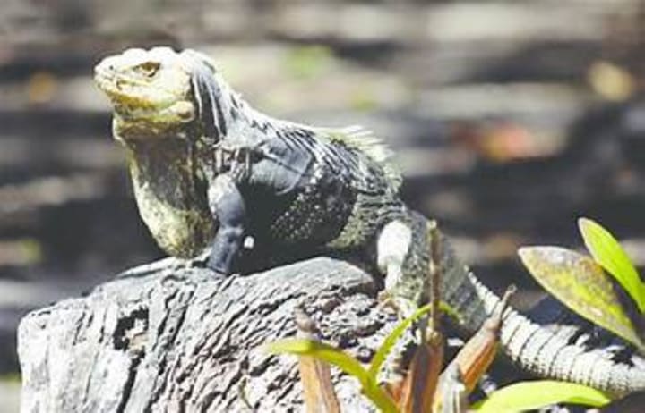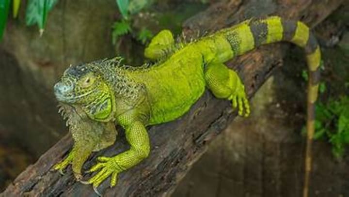 Green iguanas are large, herbivorous lizards known for their vibrant green color so they blend in with the tropical trees and bushes of Central and South America. They can grow up to 6 feet long, including their tails. They have sharp claws and powerful jaws for climbing and defending themselves. Their diet consists of leaves and fruits.