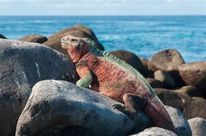 Marine iguanas are the only sea-going lizards in the world that dive into the ocean to feed on algae. Their flattened tails aid in swimming; and their dark skin absorbs sun rays so their body temperature is maintained after diving into cold water. Marine iguanas are exclusively found in the Galápagos Islands. They inhabit rocky shores in the intertidal zone, as well as marshes, mangrove swamps, and beaches across the archipelago.