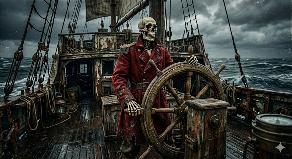 Steps creek loudly and I slip, banging into the side of the ship, covering the sleeve of my dirty shirt in more of the damp crusty filth that seems to have intruded upon every inch of the god forsaken vessel. The man that had called out to me comes into view a moment later as my head peeks over the top stair, he’s tall, a long red greatcoat, a grey beard, and not an ounce of flesh on his bones.