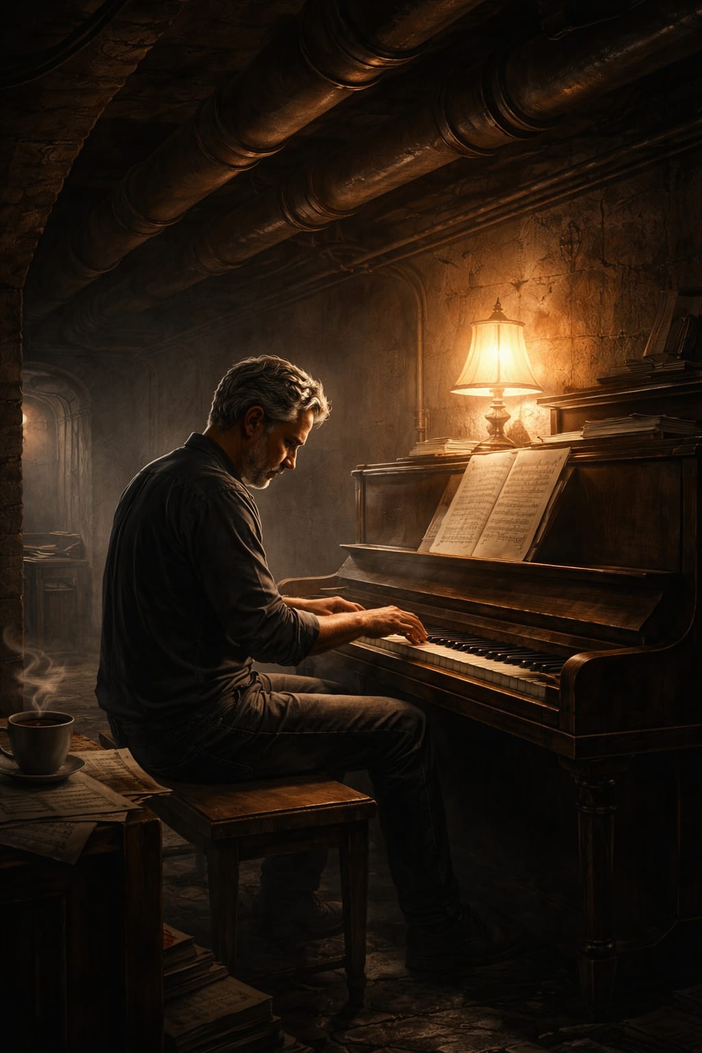 Elias had been contacted by the Resonance in year three. A woman named Petra had come to his door and whispered, with the careful economy of someone accustomed to whispering, that she had heard — through channels she declined to specify — that he still played. That he played every night, in his basement, with the door sealed. That the acoustic dampening was holding. And that there were people who would very much like to listen.