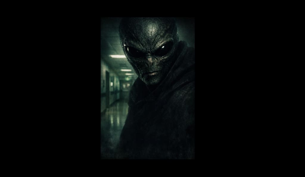 His face was unlike anything human, two large, black eyes, smooth and endless, like the greys people whisper about. But his skin was different. Dark, black and deep green threaded with faint lines, textured like reptile scales but leathery that caught the light in a way that didn’t feel natural.