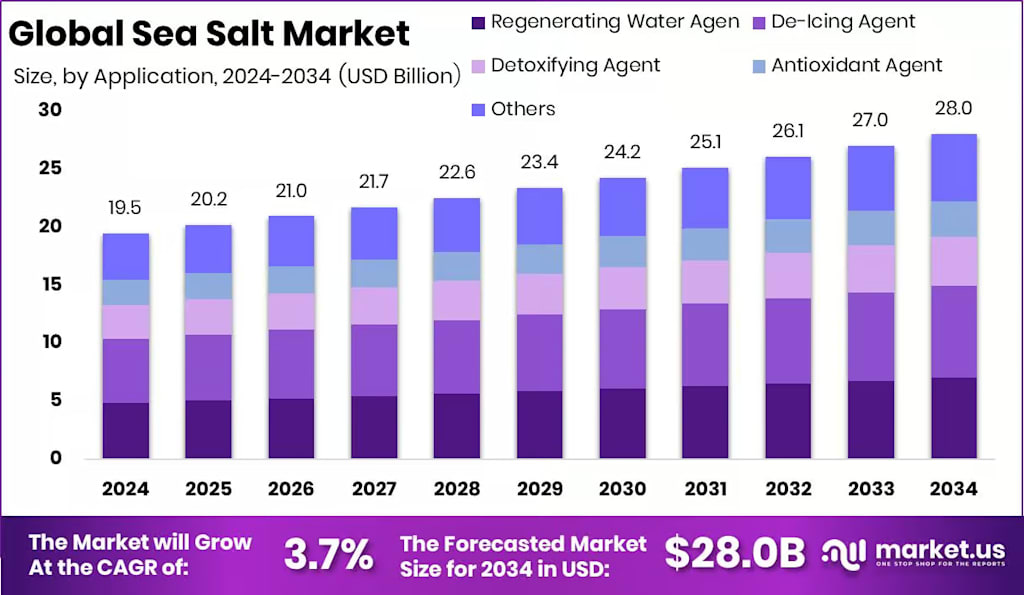 • The Global Sea Salt Market is expected to be worth around USD 28.0 billion by 2034, up from USD 19.5 billion in 2024, and is projected to grow at a CAGR of 3.7% from 2025 to 2034.