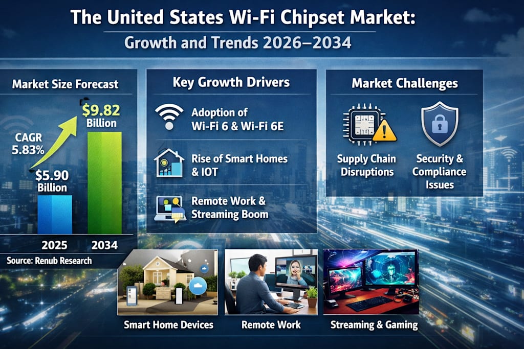 According to Renub Research, the United States Wi-Fi Chipset Market is expected to rise from US$ 5.90 Billion in 2025 to US$ 9.82 Billion by 2034, expanding at a CAGR of 5.83% from 2026 to 2034