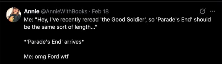 This was exactly how it happened. For my Why It's a Masterpiece series I took a quick reread of my copy of The Good Soldier, which is great because it's short and easy to read. (It's also incredibly depressing but you've read the article on it, you should know). I then thought to myself 'this can't be right...I never got around to reading Parade's End which is considered to be Ford's best work...' and quickly ordered it (it was only a couple of £ and so, nice and cheap). I didn't bother to look it up in any way, shape or form but seemed to assume it would be of similar length to The Good Soldier which can't be more than 150 pages.