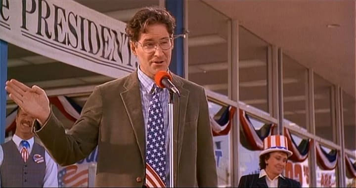 That feels quaint today where it's nearly impossible to believe in or remotely trust anyone in an elected office. In 1993 director Ivan Reitman and writer Gary Ross were able to get away with making a political movie that never once mentions a party affiliation. The film is about the United States President and yet we never learn if he is a Republican or Democrat. The politics are able to somehow be so fuzzy that it could be either party in charge. This would be considered cowardice in this day and age and Reitman and Ross would be castigated by both sides.