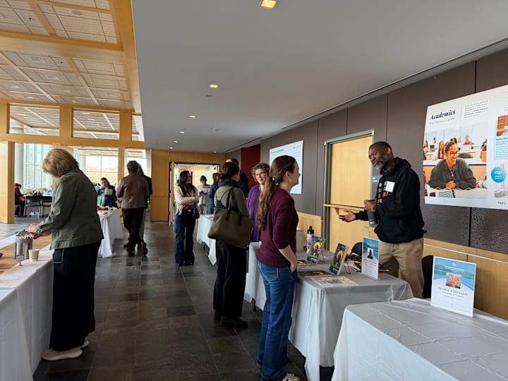 In the lobby, tables were set up for authors selling their books. Participants could drink a cup of coffee, eat a pastry, and share a conversation.