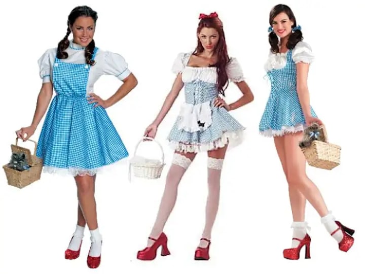 Dorothy Halloween costumes do a good job of capturing the distinct pattern and colors of the film’s wardrobe. However, the cut of the dress is under debate. In the movie, Dorothy’s dress goes past her knees and covers half her shins, but for Halloween, none go past the knees, and most don’t even cover a significant portion of the thighs.
