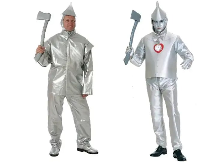 A Halloween costume like the outfit worn by Jack Haley would be very expensive and difficult to move in, so designers use their creativity to make a close representation. For men, this consists of a full-body silver suit that, with some slight modifications, could also be used for a spaceman costume. The funnel hat, ax, and sometimes heart let people know this is the Tin Woodman of Oz.