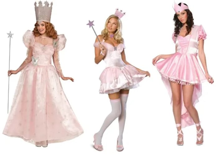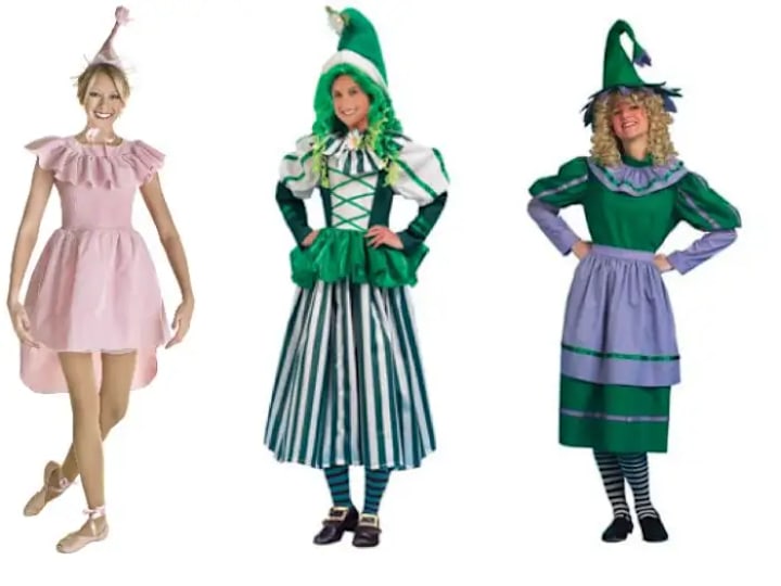 For Halloween, there is one simple puffy dress that has slightly exaggerated shoulders. By eliminating the hoop, it becomes a very practical costume. However, the other two costumes look like something that would be worn at a gentlemen’s club or in the boudoir. The fascinating thing is that all the Wicked Witch costumes are very close to the movie, but the good witch has more wicked options for her clothing choices.