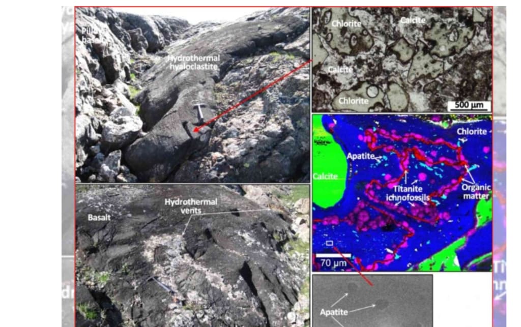 Papineau said, "Trails of spheroidal ichnofossils composed of titanite and organic matter surround abundant nanoscopic-size apatite and lepidocrocite." Instead of passive mineral growth, that pattern suggests active nutrient searching.