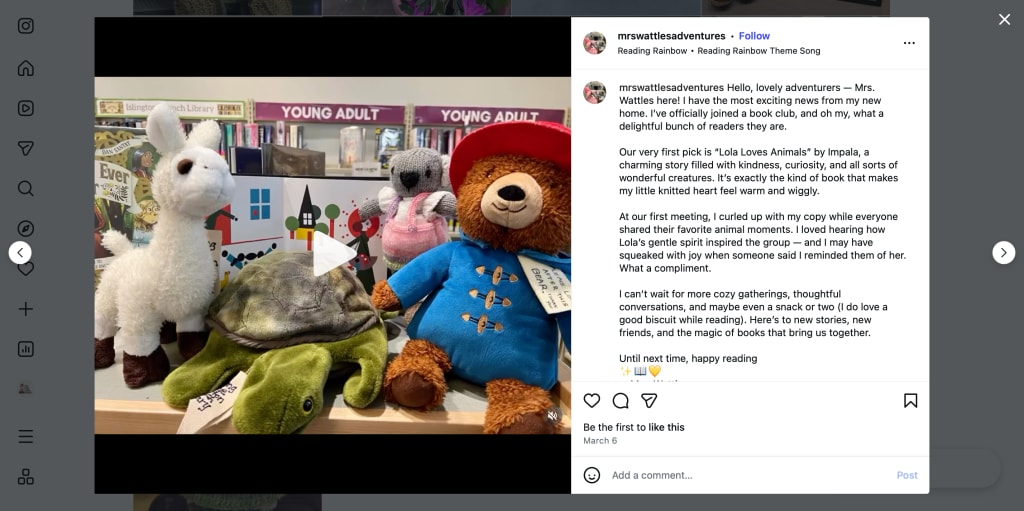 The book club met in a sunny corner of the local library, where soft chairs, warm lamps, and a table full of snacks created the perfect cozy atmosphere. Mrs. Wattles arrived with her tiny copy of Lola Loves Animals tucked under her arm, her little knitted paws trembling with excitement. She had never been to an American book club before, and she wasn’t quite sure what to expect.