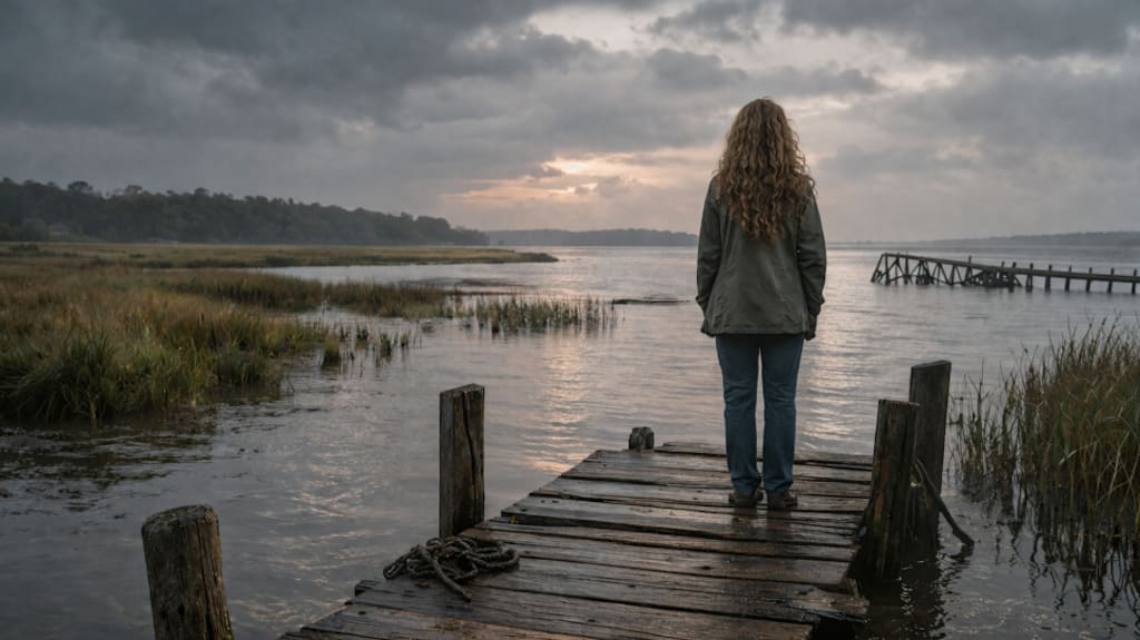 She stands on the dock and watches the line where the river opens toward the sea.