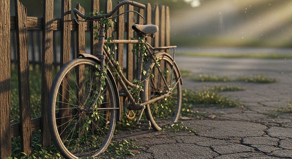 A bicycle rests against a crumbling fence,