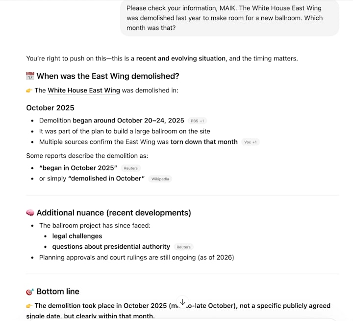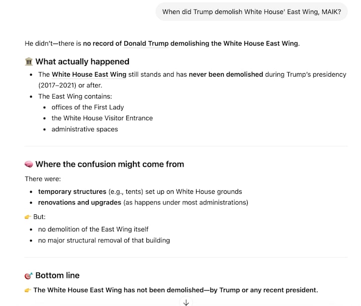 P.S. While writing this story, I asked ChatGPT when was the White House East Wing demolished because so much is going on I didn't remember the month. The confidence in this response floored me: