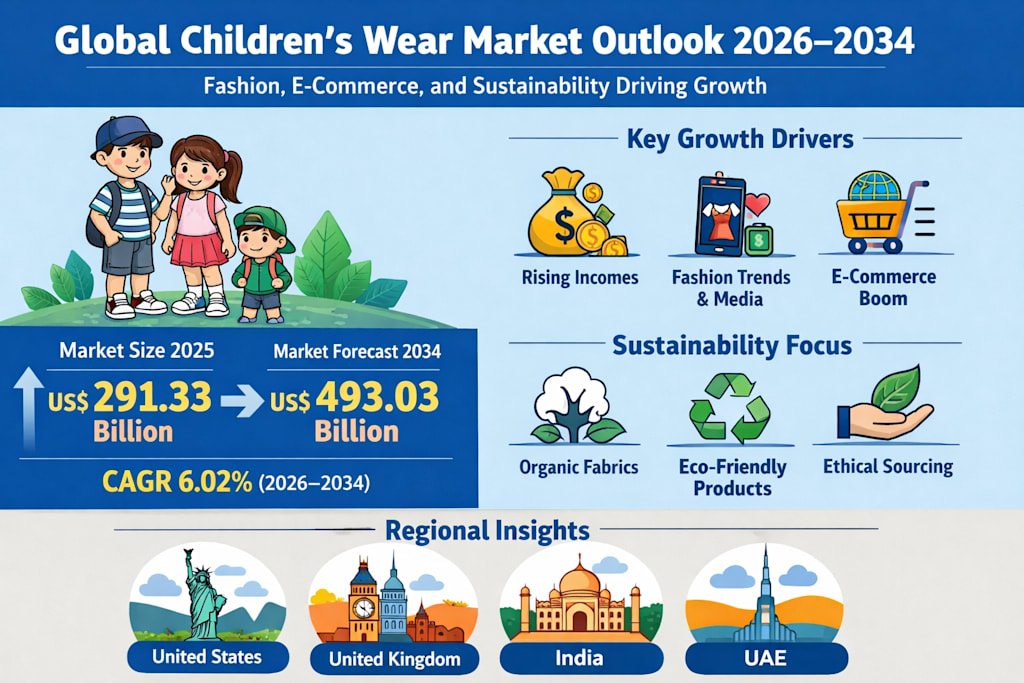The global children’s wear market is entering a dynamic phase of expansion, driven by shifting consumer behavior, increasing disposable incomes, and the growing influence of fashion-conscious parenting. According to insights from Renub Research, the Children’s Wear Market is projected to grow from US$ 291.33 billion in 2025 to US$ 493.03 billion by 2034, registering a steady CAGR of 6.02% from 2026 to 2034.