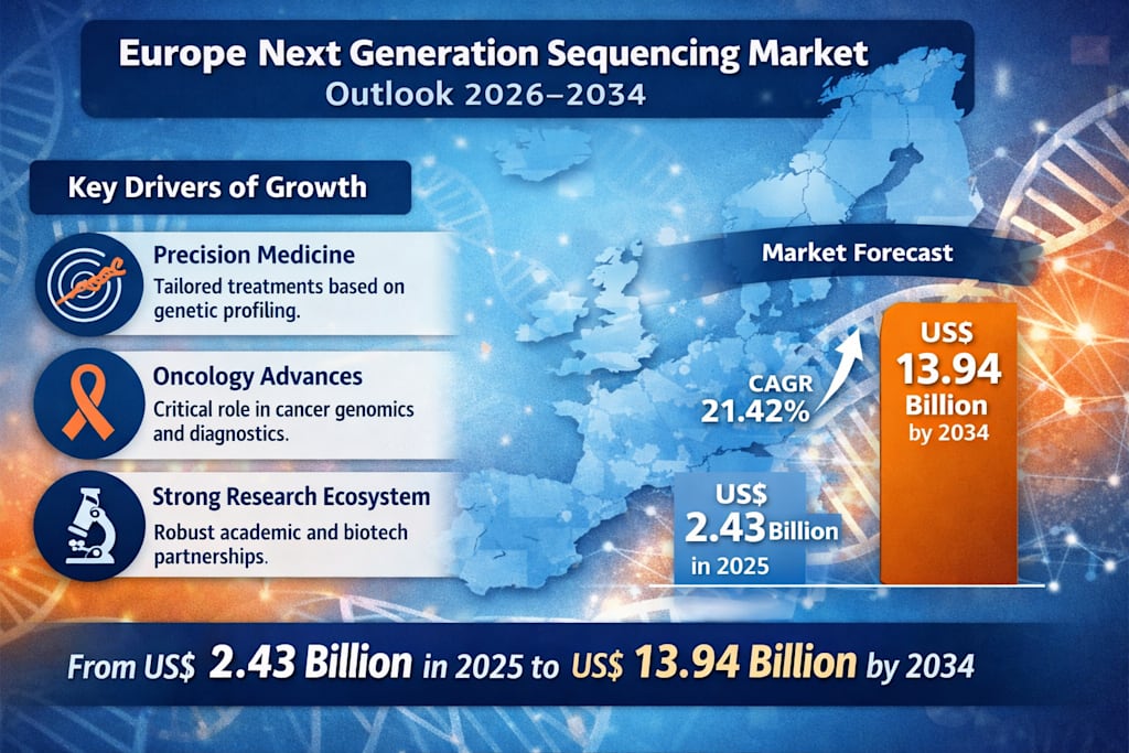 According to Renub Research, the Europe Next Generation Sequencing Market is projected to rise from US$ 2.43 billion in 2025 to US$ 13.94 billion by 2034, expanding at a remarkable CAGR of 21.42% during 2026–2034. That trajectory reflects far more than a fast-growing technology segment. It signals a broad healthcare transformation driven by better data, earlier diagnosis, and more targeted care.