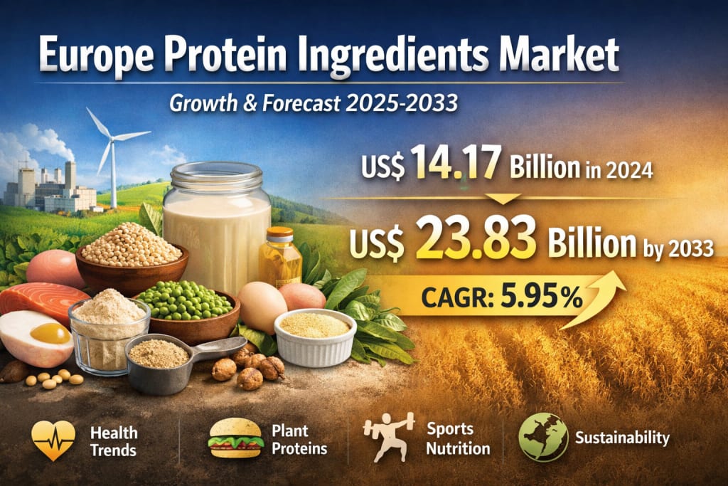 The Europe protein ingredients market is undergoing a significant transformation, driven by a combination of shifting dietary habits, technological innovation, and increasing awareness around health and sustainability. According to recent insights, the market is projected to grow from US$ 14.17 billion in 2024 to US$ 23.83 billion by 2033, expanding at a CAGR of 5.95% from 2025 to 2033 .