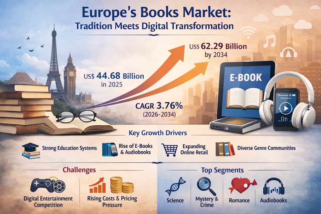 Europe’s relationship with books is centuries old, deeply intertwined with its cultural, intellectual, and educational foundations. Today, this legacy industry is not fading—it is evolving. According to recent analysis, the Europe books market is projected to grow from US$ 44.68 billion in 2025 to US$ 62.29 billion by 2034, expanding at a CAGR of 3.76% between 2026 and 2034.