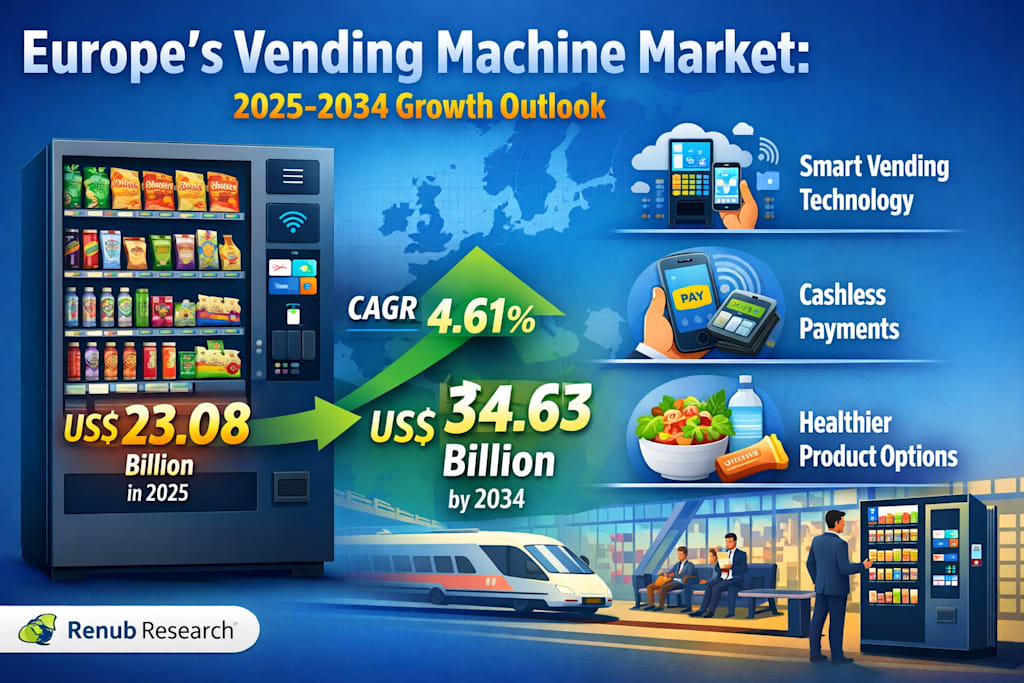 That shift is reflected in the numbers. According to the market data you shared, the Europe Vending Machine Market is expected to rise from US$ 23.08 Billion in 2025 to US$ 34.63 Billion by 2034, expanding at a CAGR of 4.61% from 2026 to 2034 .