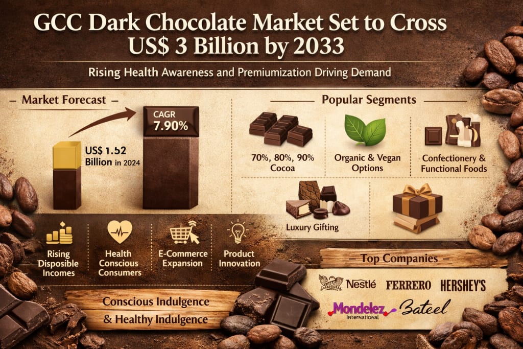 According to recent insights, the GCC Dark Chocolate Market is projected to grow from US$ 1.52 billion in 2024 to US$ 3.01 billion by 2033, expanding at a compound annual growth rate (CAGR) of 7.90% between 2025 and 2033. This growth trajectory reflects broader regional trends, including premiumization, health-conscious consumption, and digital retail evolution.
