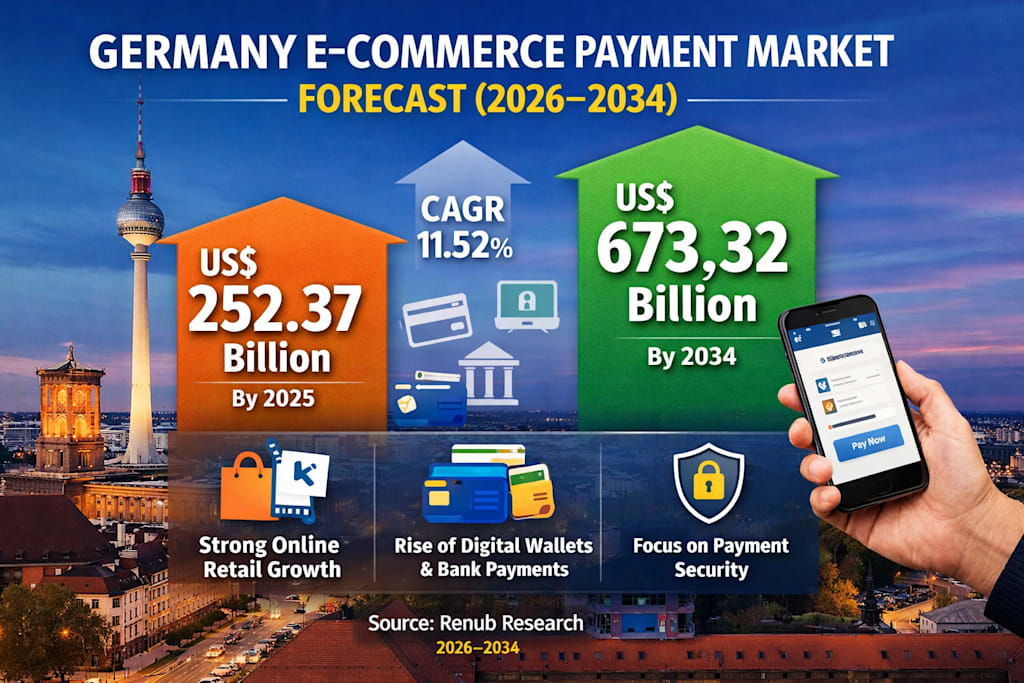 According to Renub Research, the Germany E-Commerce Payment Market is projected to rise from US$ 252.37 Billion in 2025 to US$ 673.32 Billion by 2034, growing at a CAGR of 11.52% during 2026–2034. That is not just a sign of more online shopping — it reflects a deeper change in how German consumers want to pay, how businesses want to get paid, and how technology is redefining convenience and security in the digital economy.