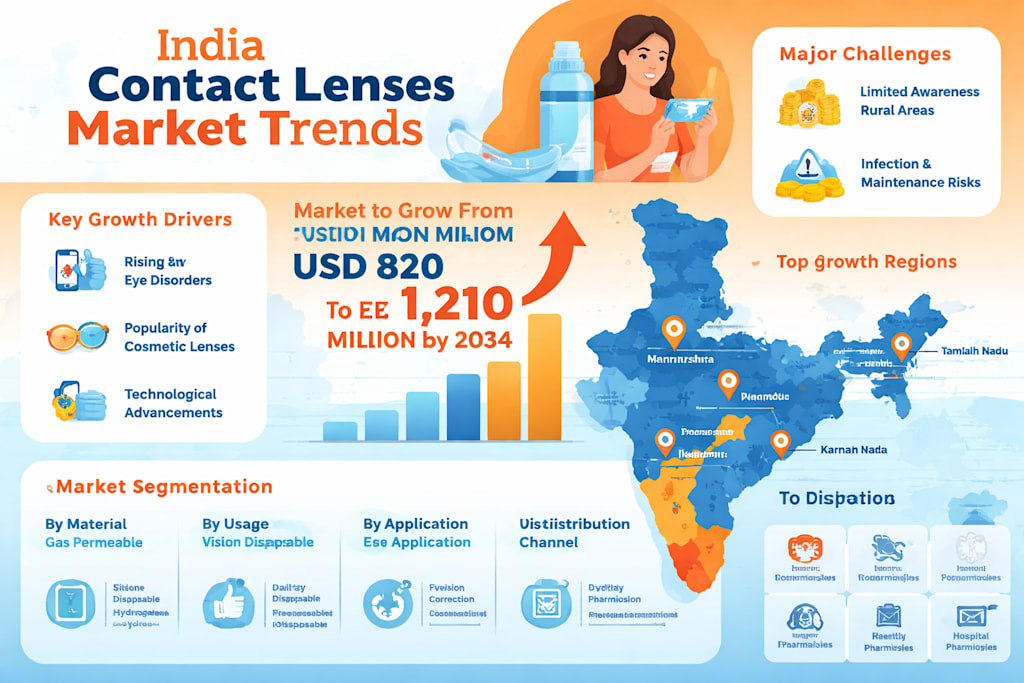 According to recent market insights, the India contact lenses market is projected to grow from US$ 820.00 million in 2025 to US$ 1,210.23 million by 2034, registering a compound annual growth rate (CAGR) of 4.42% from 2026 to 2034. This growth reflects not only increasing demand for vision correction but also evolving consumer preferences driven by convenience, fashion, and technological advancements.