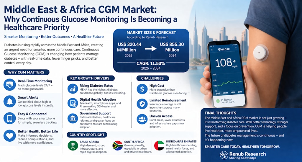 According to Renub Research, the Middle East and Africa Continuous Glucose Monitoring Market is projected to rise from US$ 320.44 Million in 2025 to US$ 855.30 Million by 2034, expanding at a CAGR of 11.53% from 2026 to 2034. That is not a minor shift. It reflects a structural transformation in how diabetes care is being delivered across the region.