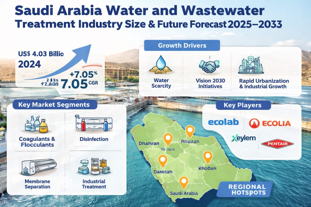Saudi Arabia’s water and wastewater treatment industry is entering a transformative phase, backed by strong government initiatives, rapid urbanization, and rising industrial demand. According to Renub Research, the market is projected to reach US$ 7.43 billion by 2033, growing from US$ 4.03 billion in 2024, at a compound annual growth rate (CAGR) of approximately 7.05% between 2025 and 2033.
