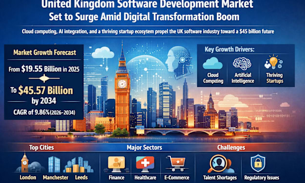 The United Kingdom’s software development market is entering a defining decade. Fueled by rapid digital transformation, increased enterprise reliance on cloud technologies, and the widespread adoption of artificial intelligence (AI), the sector is poised for substantial expansion. According to Renub Research, the market is projected to grow from US$ 19.55 billion in 2025 to US$ 45.57 billion by 2034, achieving a compound annual growth rate (CAGR) of 9.86% between 2026 and 2034 .