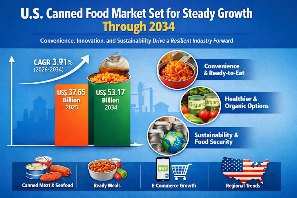 The United States canned food market is quietly undergoing a transformation. Once viewed primarily as a pantry staple for emergencies or budget-conscious households, canned foods are now evolving into a dynamic, innovation-driven segment of the broader food industry. According to recent insights, the market is projected to grow from US$ 37.65 billion in 2025 to US$ 53.17 billion by 2034, expanding at a compound annual growth rate (CAGR) of 3.91% during 2026–2034.