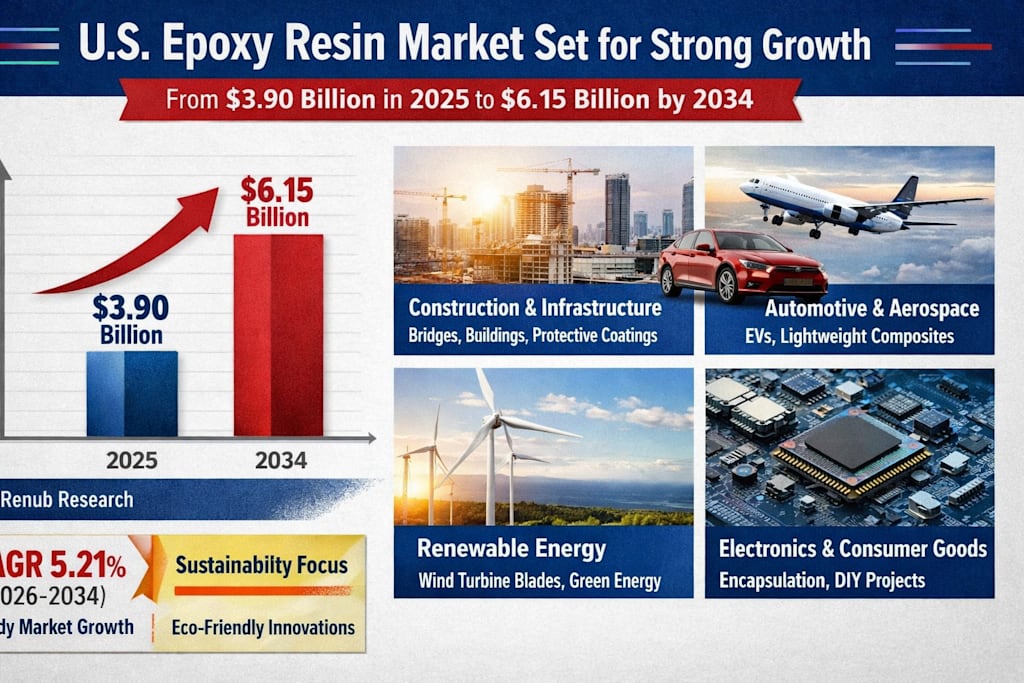 The United States epoxy resin market is entering a transformative decade, driven by the convergence of infrastructure modernization, advanced manufacturing, and sustainability trends. According to insights from Renub Research, the market is projected to grow from US$ 3.90 billion in 2025 to US$ 6.15 billion by 2034, expanding at a CAGR of 5.21% between 2026 and 2034.