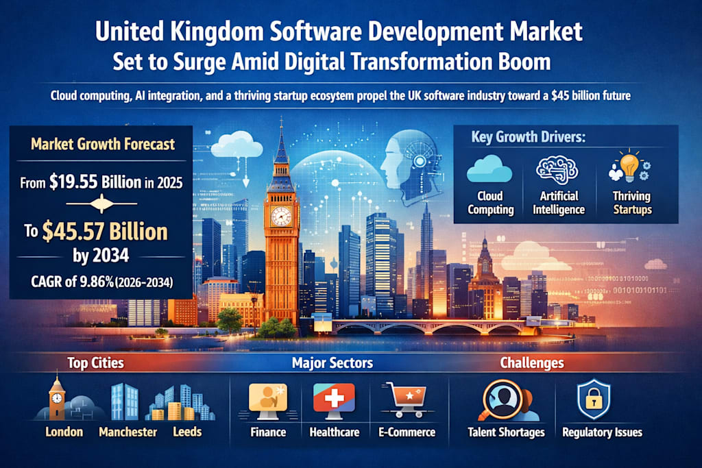 The United Kingdom’s software development market is entering a defining decade. Fueled by rapid digital transformation, increased enterprise reliance on cloud technologies, and the widespread adoption of artificial intelligence (AI), the sector is poised for substantial expansion. According to Renub Research, the market is projected to grow from US$ 19.55 billion in 2025 to US$ 45.57 billion by 2034, achieving a compound annual growth rate (CAGR) of 9.86% between 2026 and 2034 .