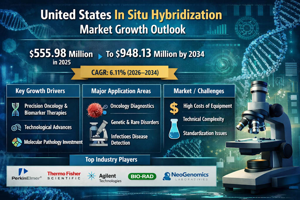 According to recent insights from Renub Research, the United States In Situ Hybridization market is projected to grow from US$ 555.98 million in 2025 to US$ 948.13 million by 2034, expanding at a compound annual growth rate (CAGR) of 6.11% from 2026 to 2034.