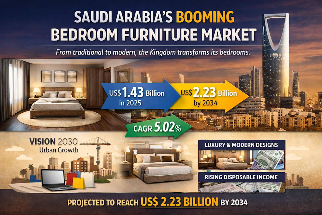 According to the market data you shared, the Saudi Arabia Bedroom Furniture Market is expected to grow from US$ 1.43 Billion in 2025 to US$ 2.23 Billion by 2034, expanding at a CAGR of 5.02% from 2026 to 2034. That is a significant climb for a category once seen as purely functional.