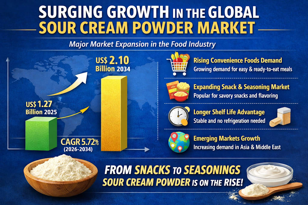 According to the market brief you provided, the Global Sour Cream Powder Market is expected to grow from US$ 1.27 billion in 2025 to US$ 2.10 billion by 2034, expanding at a CAGR of 5.72% from 2026 to 2034 . That kind of growth tells an important story: manufacturers, retailers, foodservice brands, and consumers are all placing greater value on ingredients that are flavorful, practical, and easier to store than fresh dairy.