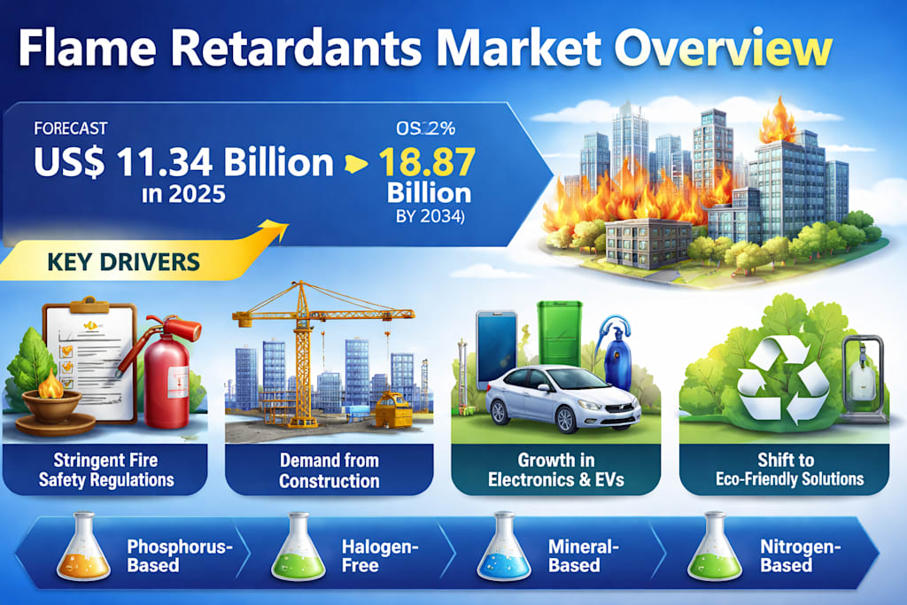That growing need is helping drive strong momentum in the global flame retardants market. According to the user-provided market brief, the Flame Retardants Market is expected to grow from US$ 11.34 billion in 2025 to US$ 18.87 billion by 2034, expanding at a CAGR of 5.82% from 2026 to 2034. That projection reflects a market being pushed forward by regulation, industrial demand, and the rising importance of safety-first material engineering.