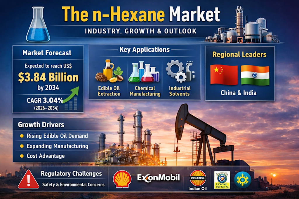 According to the market data you provided, the global n-Hexane Market is expected to rise from US$ 2.93 billion in 2025 to US$ 3.84 billion by 2034, growing at a CAGR of 3.04% from 2026 to 2034. That kind of growth may look modest on the surface, but in a mature industrial category, it signals resilience, consistency, and long-term relevance.