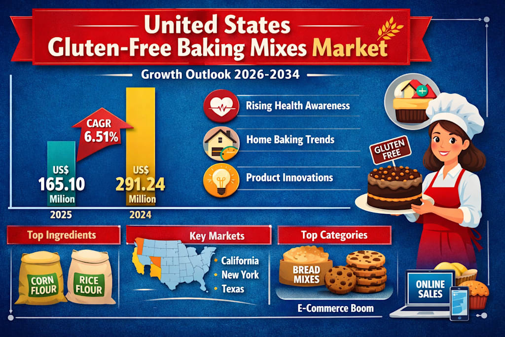 According to market insights provided in the attached research, the United States Gluten-Free Baking Mixes Market is projected to grow from US$ 165.10 Million in 2025 to US$ 291.24 Million by 2034, expanding at a CAGR of 6.51% from 2026 to 2034. This growth reflects more than just dietary restrictions — it highlights a much larger shift in American eating habits, wellness priorities, and at-home cooking behavior.