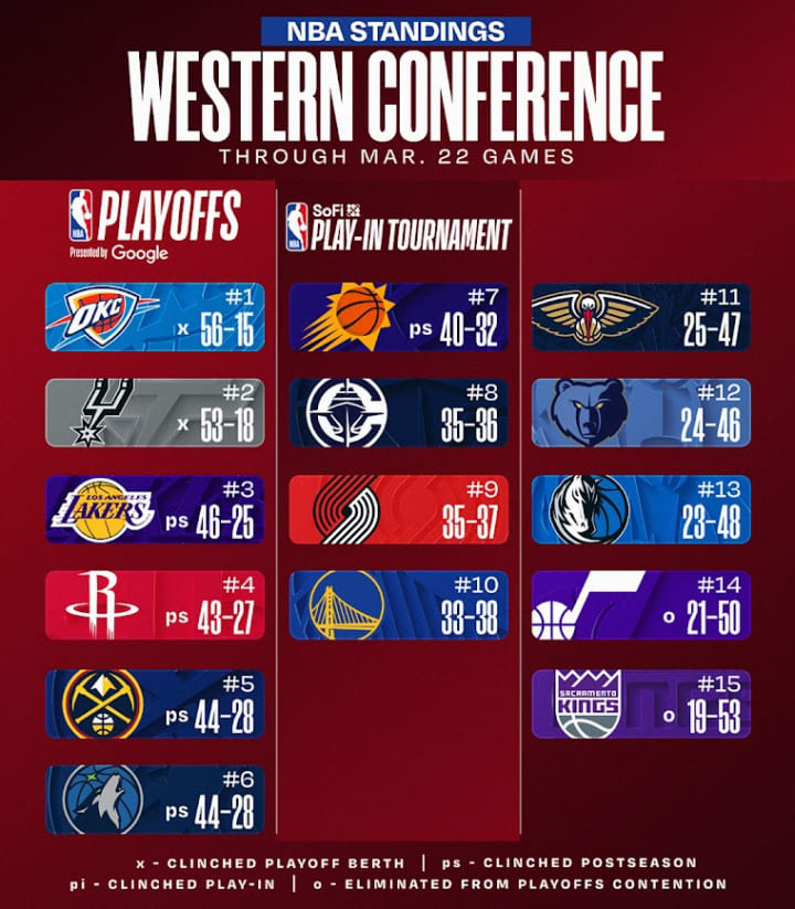 The Play-In Tournament takes place from April 14-17, and the actual playoffs starts on April 18. Just over three weeks until the postseason starts. This home stretch has been absolutely amazing, and I'm excited to see what the final 21 days of the season will bring us!